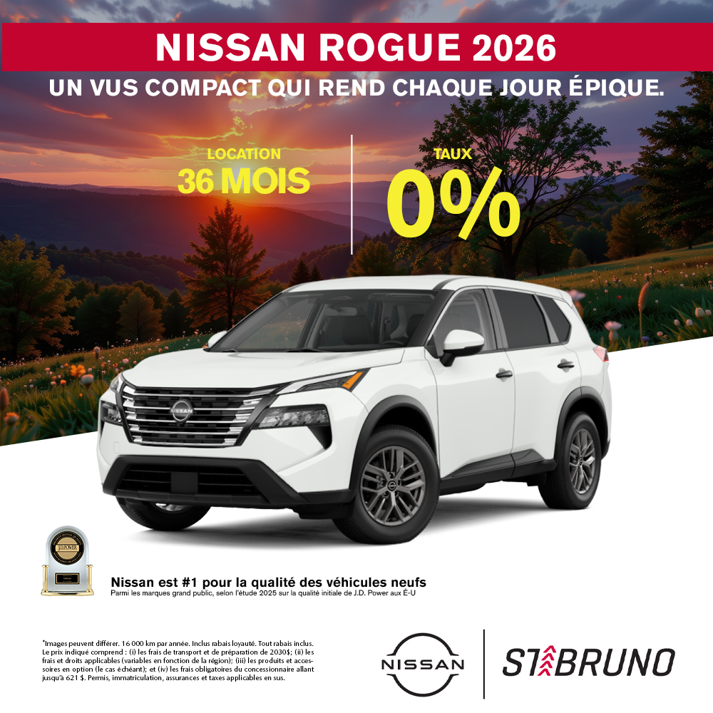 Ce Nissan Rogue 2026 est disponible chez St-Bruno Nissan à Saint-Basile-le-Grand. Contactez notre équipe des ventes ou venez nous visiter au 221 Blvd. Sir-Wilfrid-Laurier pour obtenir plus d'informations, en faire l'essai ou le réserver.